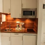 This apartment provides coffee and tea making equipment and a fully-fitted kitchen with a microwave oven, a fridge, and kitchenware.